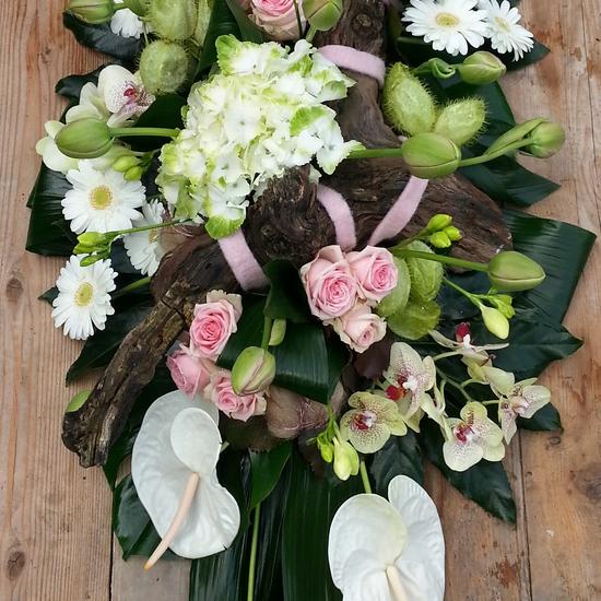 Kistbedekking met luxe bloemen en hout stonken. Let op! Bloemen in het geleverde bloemwerk kunnen afwijken van het hier afgebeelde product. Wilt u een andere kleur? Geen probleem! Voer uw eigen kleur in.